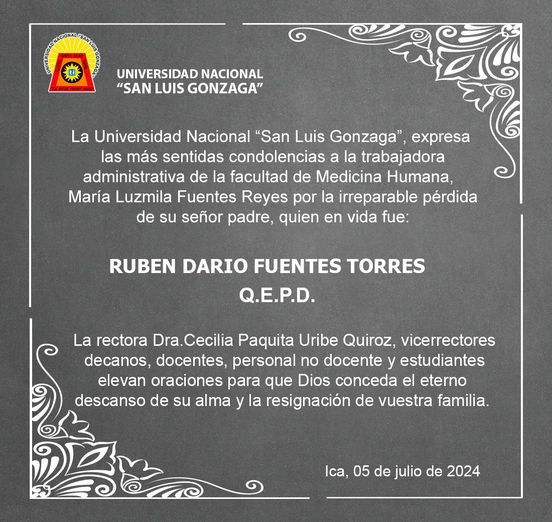 | La Universidad Nacional “San Luis Gonzaga”, expresa las más sentidas condolencias a la trabajadora administrativa de la facultad de Medicina Humana, María Luzmila Fuentes Reyes por la irreparable pérdida de su señor padre, quien en vida fue: