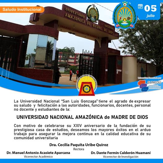 #SaludosInstitucionales2024 | La Universidad Nacional “San Luis Gonzaga” tiene el agrado de expresar su saludo y felicitación a las autoridades, funcionarios, docentes, personal no docente y estudiantes de la Universidad Nacional Amazónica de Madre de Dios