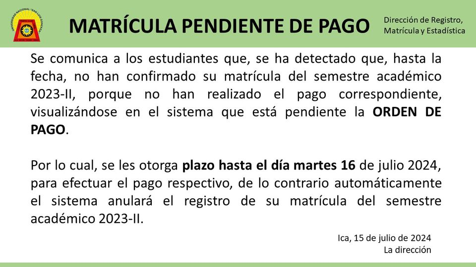 confirmado su matrícula del semestre académico 2023-II, porque no han realizado el pago correspondiente, visualizándose en el sistema que está pendiente la ORDEN DE PAGO. Por lo cual, se les otorga plazo hasta el día martes 16 de julio 2024, para efectuar el pago respectivo, de lo contrario automáticamente el sistema anulará el