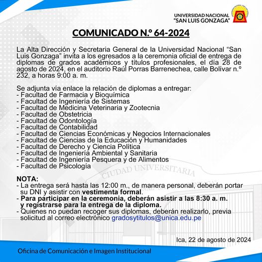 #EntregaDiplomas La Alta Dirección y Secretaria General de la Universidad Nacional “San Luis Gonzaga” invita a los egresados a la ceremonia oficial de entrega de diplomas de grados académicos y títulos profesionales, el día 28 de agosto de 2024, en el auditorio Raúl Porras Barrenechea, calle Bolívar n.º 232, a horas 9:00 a. m.