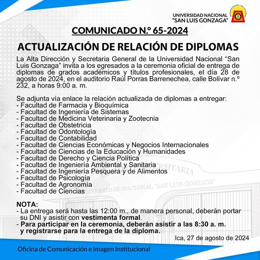 La Alta Dirección y Secretaria General de la Universidad Nacional “San Luis Gonzaga” invita a los egresados a la ceremonia oficial de entrega de diplomas de grados académicos y títulos profesionales, el día 28 de agosto de 2024, en el auditorio Raúl Porras Barrenechea, calle Bolívar n.º 232, a horas 9:00 a. m.