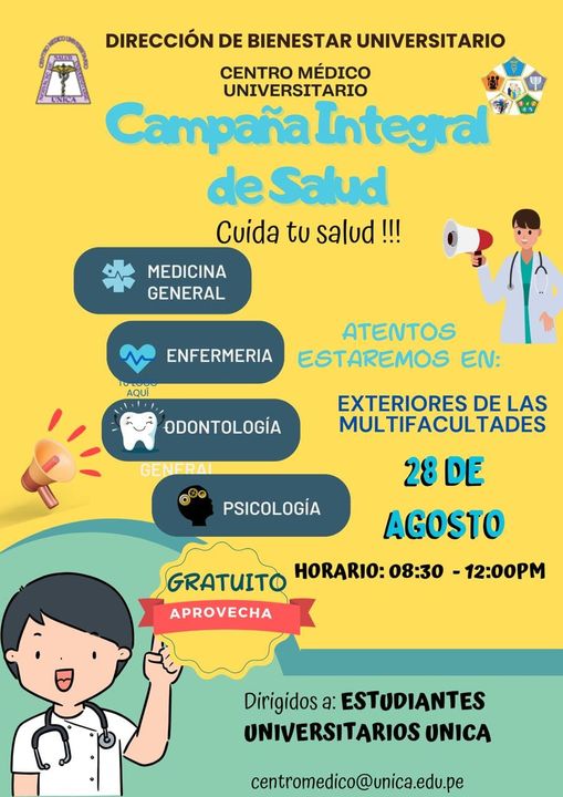 #CampañaMédica | Con el objetivo de decentralizar la atención médica para los estudiantes de la UNICA, se desarrollará la campaña integral de salud, CUIDA TU SALUD en los exteriores de la multifacultades instalaciones de la Ciudad Universitaria.