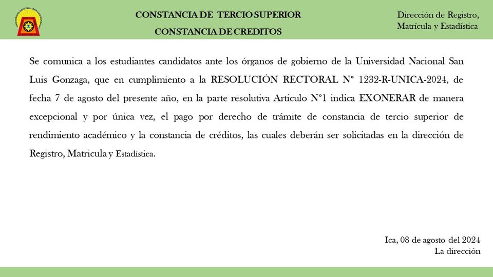 #direccionderegistro,matriculayestadistica | Se comunica a los estudiantes candidatos ante los órganos de gobierno de la Universidad Nacional San Luis Gonzaga, que en cumplimiento a la RESOLUCIÓN RECTORAL N° 1232-R-UNICA-2024, de fecha 7 de agosto del presente año, en la parte resolutiva Articulo N°1 indica EXONERAR de manera excepcional y por única vez, el pago por derecho de trámite de constancia de tercio superior de rendimiento académico y la constancia de créditos, las cuales deberán ser solicitadas en la dirección de Registro, Matricula y Estadística.
