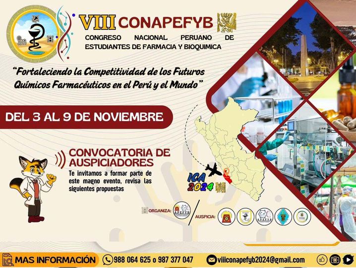 #FacultaddeFarmaciayBioquimica | El 𝙑𝙄𝙄𝙄 𝘾𝙊𝙉𝙂𝙍𝙀𝙎𝙊 𝙉𝘼𝘾𝙄𝙊𝙉𝘼𝙇 𝙋𝙀𝙍𝙐𝘼𝙉𝙊 𝘿𝙀 𝙀𝙎𝙏𝙐𝘿𝙄𝘼𝙉𝙏𝙀𝙎 𝘿𝙀 𝙁𝘼𝙍𝙈𝘼𝘾𝙄𝘼 𝙔 𝘽𝙄𝙊𝙌𝙐𝙄𝙈𝙄𝘾𝘼, VIII CONAPEFYB que se llevará a cabo en ICA, esta en busqueda de auspiciadores que deseen apoyar este importante evento que reunirá a muchos estudiantes y profesionales de la región.