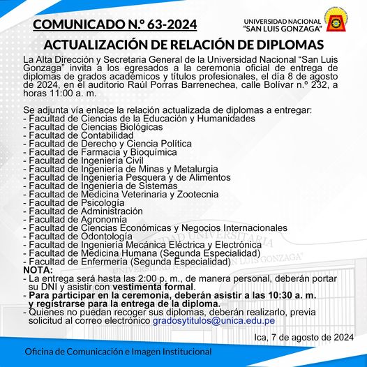 La Alta Dirección y Secretaria General de la Universidad Nacional “San Luis Gonzaga” comunica que por fuerza mayor, se reprograma la fecha de entrega de diplomas de grados académicos y títulos profesionales del día 7 de agosto para el jueves 8 de agosto de 2024, en el auditorio Raúl Porras Barrenechea, calle Bolívar n.º 232, a horas 11:00 a. m.