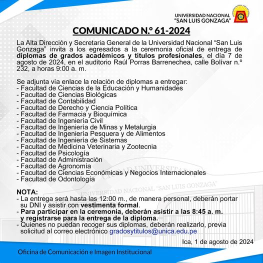 #EntregaDiplomas La Alta Dirección y Secretaria General de la Universidad Nacional “San Luis Gonzaga” invita a los egresados a la ceremonia oficial de entrega de diplomas de grados académicos y títulos profesionales, el día 7 de agosto de 2024, en el auditorio Raúl Porras Barrenechea, calle Bolívar n.º 232, a horas 9:00 a. m.
