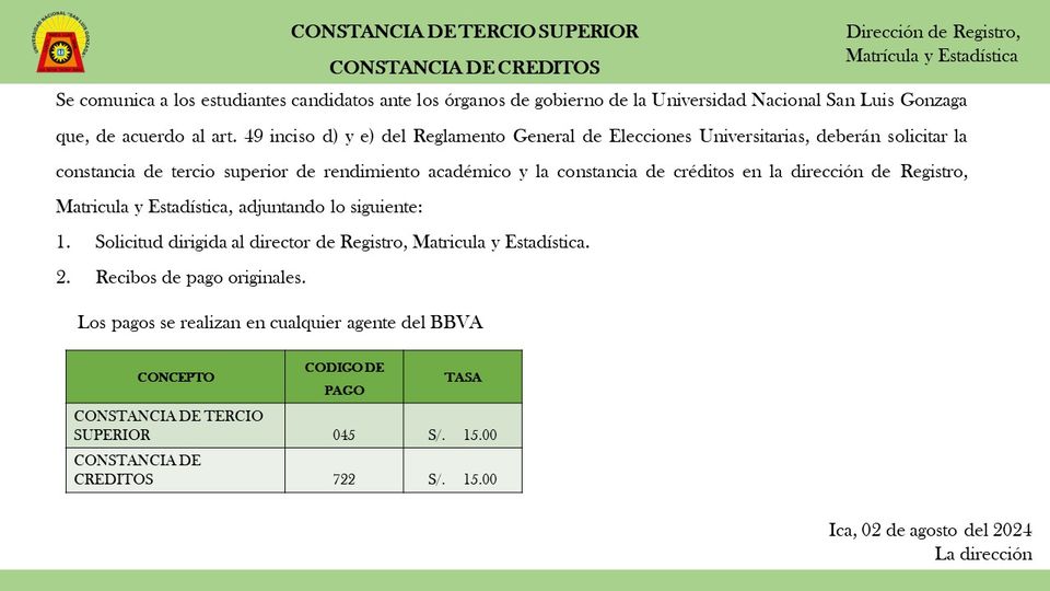 #direcciónderegistromatriculayestadística | Se comunica a los estudiantes candidatos ante los órganos de gobierno de la Universidad Nacional San Luis Gonzaga que, de acuerdo al art. 49 inciso d) y e) del Reglamento General de Elecciones Universitarias, deberán solicitar la constancia de tercio superior de rendimiento académico y la constancia de créditos en la dirección de Registro, Matricula y Estadística, adjuntando lo siguiente: