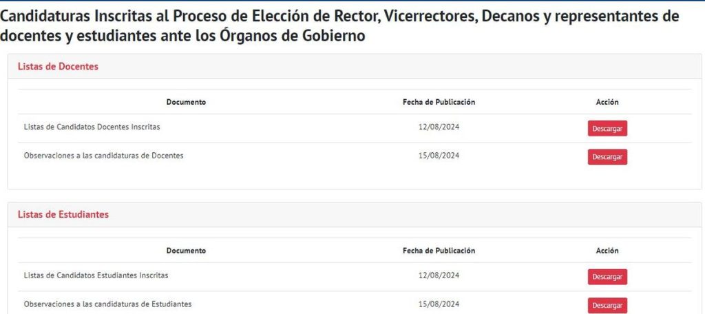 Candidaturas Inscritas al Proceso de Elección de Rector, Vicerrectores, Decanos y representantes de docentes y estudiantes ante los Órganos de Gobierno.