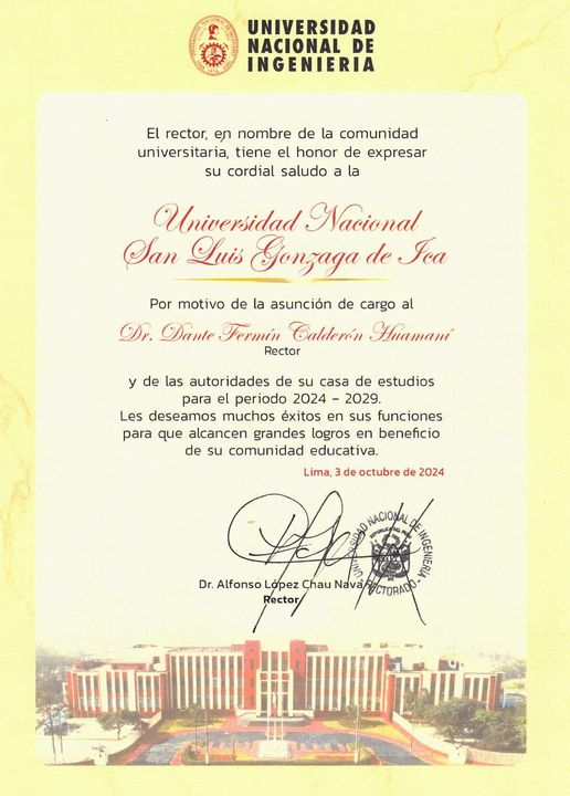 #SaludosUNI | La Universidad Nacional de Ingeniería, hace llegar los saludos de su Casa Superior de Estudios, con motivo de la Asunción al cargo de rector al Dr. Dante Fermín Calderón Huamaní rector de la Universidad Nacional San Luis Gonzaga, así como a las autoridades de nuestra casa de estudios para el periodo 2024 -2029