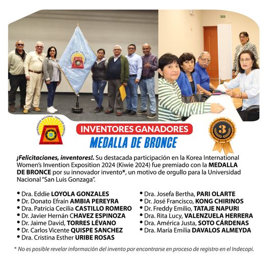 #VicerrectoradoInvestigación | ¡Felicitaciones, inventores!. Su destacada participación en la Korea International Women’s Invention Exposition 2024 (Kiwie 2024) fue premiado con la MEDALLA DE BRONCE por su innovador invento*, un motivo de orgullo para la Universidad Nacional “San Luis Gonzaga”.