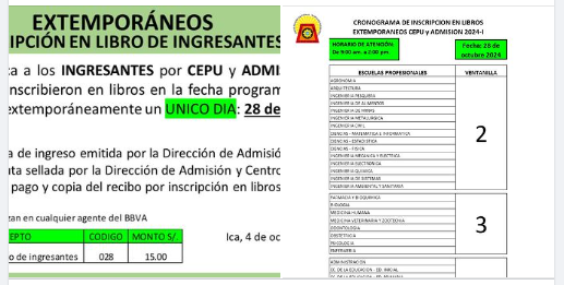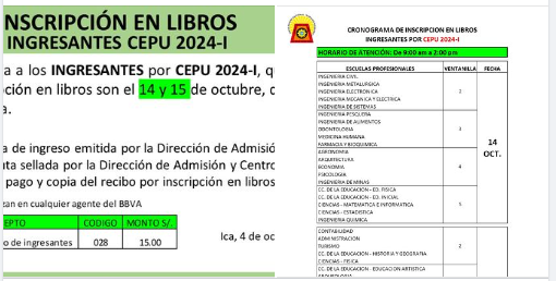 #Comunicado | La dirección de Registro, Matrícula y Estadística comunica a los INGRESANTES por CEPU 2024-I, que las fechas para inscripción en libros son el 14 y 15 de octubre, de acuerdo al cronograma.
