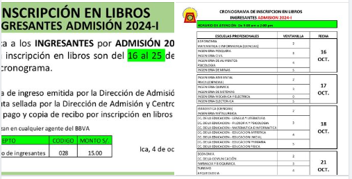 #Comunicado | La dirección de Registro, Matrícula y Estadística comunica a los INGRESANTES por ADMISIÓN 2024-I, que las fechas para inscripción en libros son el 16 al 25 de octubre, de acuerdo al cronograma.