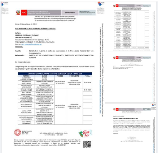 La SUNEDU mediante Oficio Nº 00621-2024-SUNEDU-DS-DIRGRATU-URGT, informa a Secretaria General el reconocimiento de la firma del rector Dr. Dante Calderón Huamaní, como vicerrector académico al Dr. José Rojas Campos, vicerrectora de investigación a la Dra. Cecilia Paquita Uribe Quiroz y de los 23 decanos electos democráticamente.