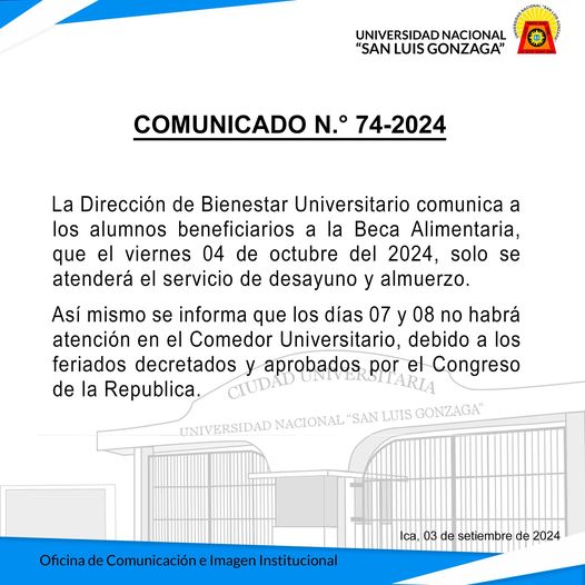 #direcciondebienestaruniversitario | La Dirección de Bienestar Universitario comunica a los alumnos beneficiarios a la Beca Alimentaria, que el viernes 04 de octubre del 2024, solo se atenderá el servicio de desayuno y almuerzo.Así mismo se informa que los días 07 y 08 no habrá atención en el Comedor Universitario, debido a los feriados decretados y aprobados por el Congreso de la Republica.