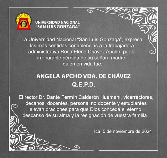 CONDOLENCIAS | La Universidad Nacional “San Luis Gonzaga”, expresa las más sentidas condolencias a la trabajadora administrativa Rosa Elena Chávez Apcho, por la irreparable pérdida de su señora madre, quien en vida fue: Angela Apcho Vda. de Chávez.