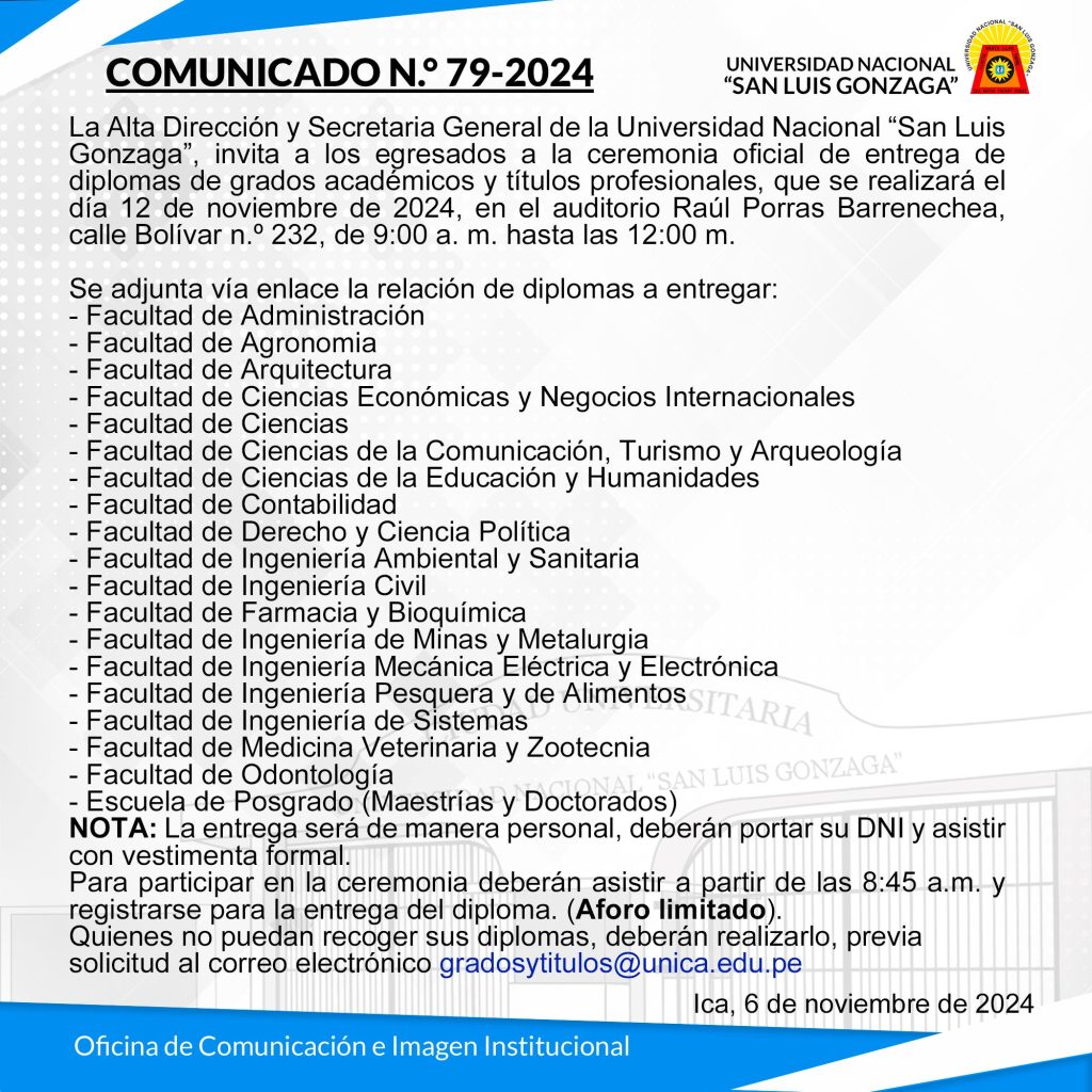 #EntregaDiploma | La Alta Dirección y Secretaria General de la Universidad Nacional “San Luis Gonzaga”, invita a los egresados a la ceremonia oficial de entrega de diplomas de grados académicos y títulos profesionales, que se realizará el día 12 de noviembre de 2024, en el auditorio Raúl Porras Barrenechea, calle Bolívar n.º 232, de 9:00 a. m. hasta las 12:00 m.