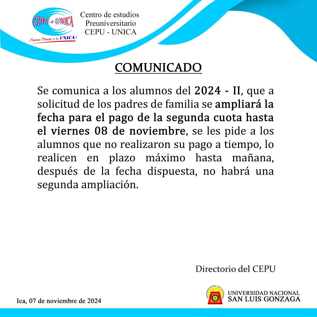 Estimado alumnos del CEPU 2024 – II, que no pudieron realizar su pago de la segunda cuota a tiempo en la fecha establecida como último día, tendrán plazo hasta el día de mañana, viernes 08 de noviembre, se admitirán pagos sólo para la segunda cuota, no se admitirá más matrículas de alumnos nuevos.