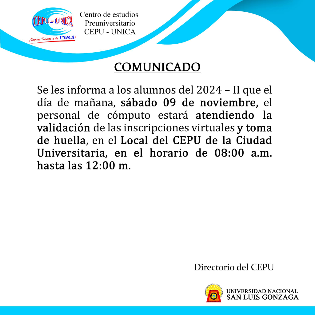 #Comunicado | Atención sábado de 08:00 a.m. hasta las 12:00 m. en el Local del CEPU ciudad universitaria., para la validación de la inscripción virtual y recojo de datos biométricos.