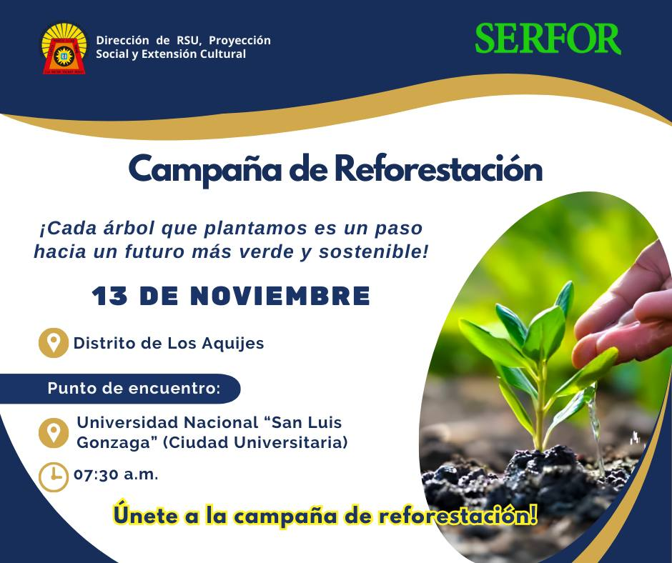 La Dirección de RSU, Proyección Social y Extensión Cultural en coordinación con el Servicio Nacional Forestal y de Fauna Silvestre – SERFOR, realizará la Campaña de Reforestación en el distrito de Los Aquijes