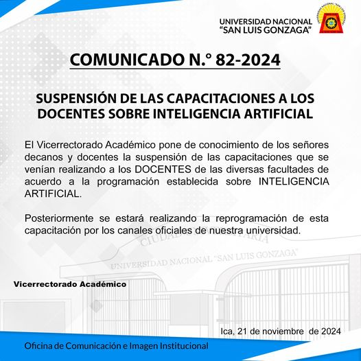 #Comunicado | El Vicerrectorado Académico pone de conocimiento de los señores decanos y docentes la suspensión de las capacitaciones que se venían realizando a los DOCENTES de las diversas facultades de acuerdo a la programación establecida sobre INTELIGENCIA ARTIFICIAL.