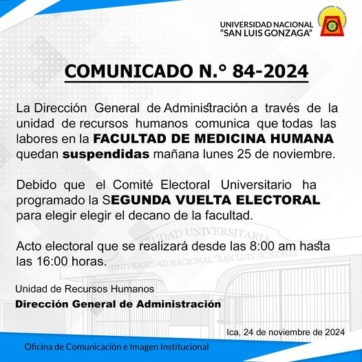 #Comunicado | La Dirección General de Administración, a través de la unidad de recursos humanos comunica que mañana todas las labores quedan SUSPENDIDAS en la Facultad de Medicina Humana por llevarse acabo la SEGUNDA VUELTA ELECTORAL para elegir al decano.