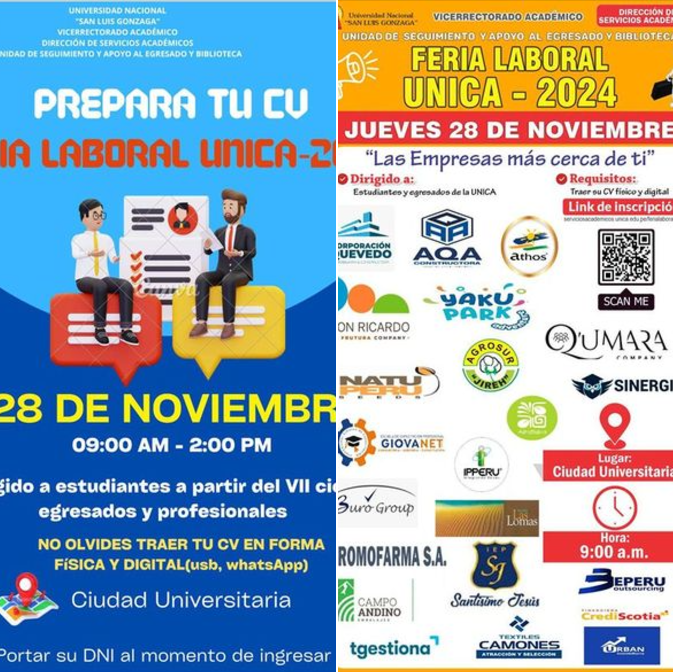 #FeriaLaboral | Este 28 de noviembre Feria Laboral UNICA 2024. 😃La Dirección de Servicios Académicos a través de la Unidad de