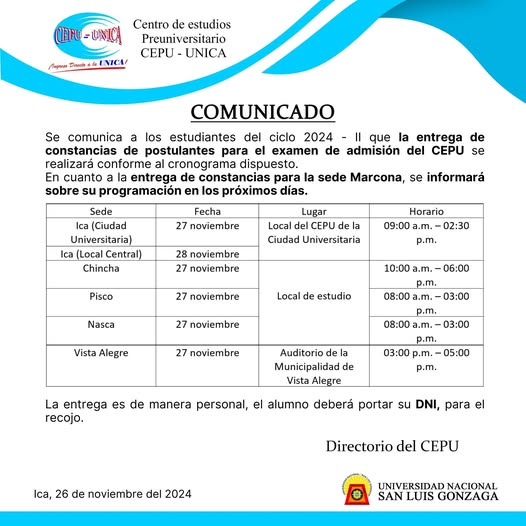 El recojo de las constancias se realizará de manera personal, para ello el alumno deberá portar su DNI.