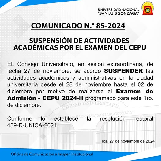 #Comunicado | El Consejo Universitario, en sesión extraordinaria, de fecha 27 de noviembre, acordó SUSPENDER las actividades académicas y administrativas en la ciudad universitaria, desde el 28 de noviembre hasta el 02 de diciembre, por motivo de realizar el Examen de Admisión – CEPU 2024-II programado para este 1 de diciembre.
