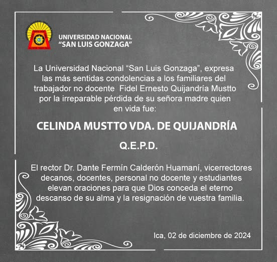| La Universidad Nacional “San Luis Gonzaga”, expresa las más sentidas condolencias a los familiares del trabajador no docente Fidel Ernesto Quijandría Mustto, por la irreparable pérdida de su señora madre quien en vida fue: