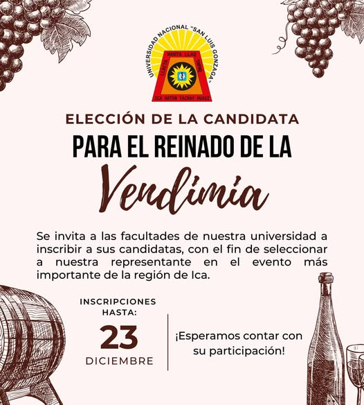 Con el objetivo de fomentar la participaci贸n y representaci贸n de nuestra instituci贸n en eventos culturales y tradicionales de la regi贸n, anunciamos la apertura de inscripciones de candidatas para elegir a quien nos representar谩 en el pr贸ximo reinado de la Vendimia 2025.