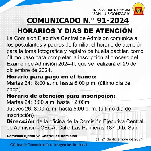 #Admisión2024II | La Comisión Ejecutiva Central de Admisión comunica a los postulantes y padres de familia, el horario de atención para la toma fotográfica y registro de huella dactilar, como último paso para completar la inscripción al proceso del Examen de Admisión 2024-II, que se realizará el 29 de diciembre de 2024.