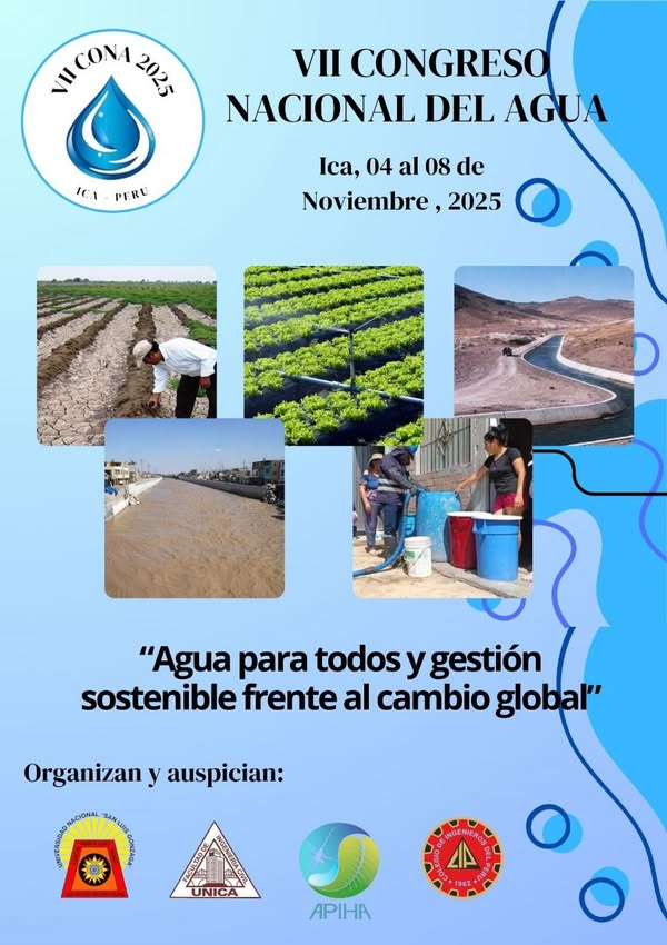 #Fic | Por encargo de la Asociación Peruana de Ingeniería Hidráulica y Ambiental APIHA, la Universidad Nacional San Luis Gonzaga, representada por la Facultad de Ingeniería Civil, será la sede y organizará el VII CONGRESO NACIONAL DEL AGUA – VII CONA PERÚ del 4 al 8 de noviembre de 2025. Es el más importante evento sobre recursos hídricos del país que reúne a científicos, investigadores, docentes, profesionales y empresas vinculadas al agua, más aún en nuestra región donde existe un déficit hídrico y se requieren alternativas para su uso sostenible. Todos a participar y apoyar.….!!!!