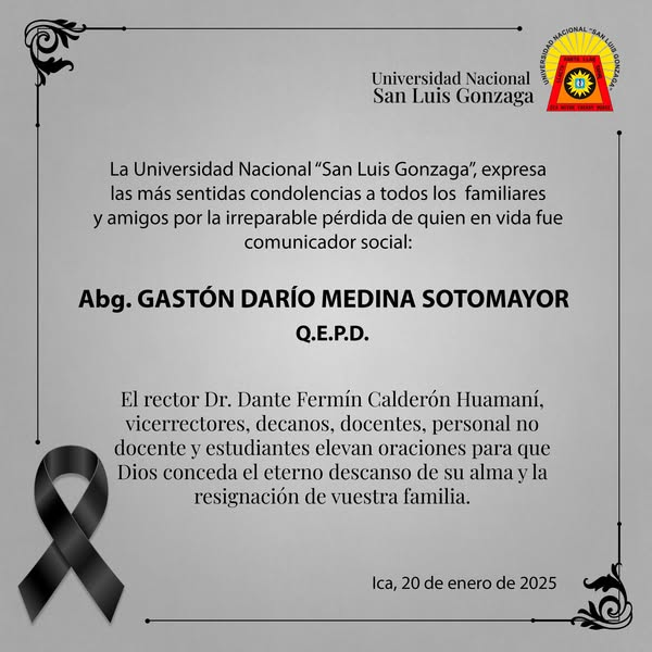 La Universidad Nacional “San Luis Gonzaga”, expresa las más sentidas condolencias a todos los familiares y amigos por la irreparable pérdida de quien en vida fue comunicador social: Abg. GASTÓN DARÍO MEDINA SOTOMAYOR, Q.E.P.D.
