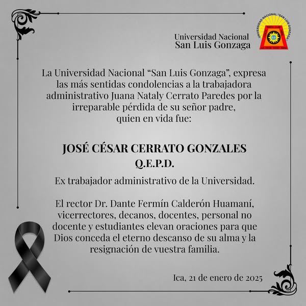La Universidad Nacional “San Luis Gonzaga”, expresa las más sentidas condolencias a la trabajadora administrativo Juana Nataly Cerrato Paredes por la irreparable pérdida de su señor padre, quien en vida fue: José César Cerrato González, es trabajador administrativo de la Universidad.