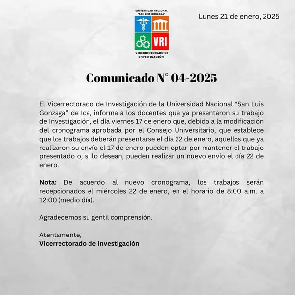 #Comunicado | El Vicerrectorado de Investigación de la Universidad Nacional “San Luis Gonzaga” de Ica, informa a los docentes que ya presentaron su trabajo de Investigación, el día viernes 17 de enero que, debido a la modificación del cronograma aprobada por el Consejo Universitario, que establece que los trabajos deberán presentarse el día 22 de enero, aquellos que ya realizaron su envío el 17 de enero pueden optar por mantener el trabajo presentado o, si lo desean, pueden realizar un nuevo envío el día 22 de enero.