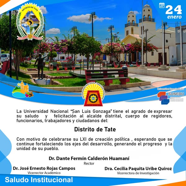 #SaludosInstitucionales2025 | La Universidad Nacional “San Luis Gonzaga” tiene el agrado de expresar su saludo y felicitación al alcalde distrital, cuerpo de regidores, funcionarios, trabajadores y ciudadanos del Distrito de Tate. Municipalidad Distrital de Tate – Gestión 2023 – 2026