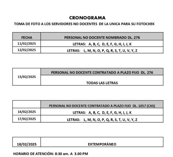 #Fotocheck | Se comunica a los servidores no docentes de la universidad, el cronograma de la toma fotográfica para la elaboración e impresión de los fotocheck, la misma que nos identificará como miembro de la Universidad Nacional San Luis Gonzaga.