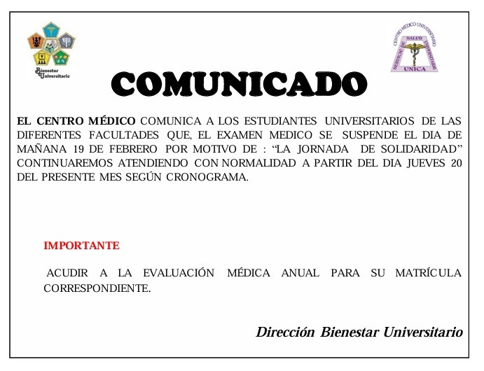 #centromedico | Centro médico comunica a los estudiantes de las diferentes facultades que la atención se suspende el día de mañana 19, por la jornada de solidaridad; se atenderá con normalidad el día jueves 20 del presente mes.