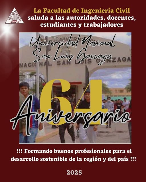 Publicado el 18 febrero, 202519 febrero, 2025 por Imagen InstitucionalLA FACULTAD DE INGENIERÍA CIVIL EXPRESA SUS SALUDOS A LA UNSLG POR SUS 64° ANIVERSARIO. #Fic | Saludo en los 64 años de funcionamento.