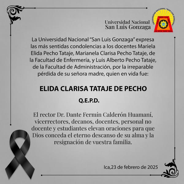 La Universidad Nacional “San Luis Gonzaga” expresa las más sentidas condolencias a los docentes Mariela Elida Pecho Tataje, Marianela Clarisa Pecho Tataje, de la Facultad de Enfermería, y Luis Alberto Pecho Tataje, de la Facultad de Administración, por la irreparable pérdida de su señora madre, quien en vida fue: ELIDA CLARISA TATAJE DE PECHO, Q.E.P.D.
