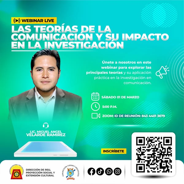 #La Dirección de RSU, Proyección Social y Extensión Cultural, en coordinación con la Facultad de Ciencias de la Comunicación, Turismo y Arqueología, los invita a participar del webinar: «Las teorías de la Comunicación y su impacto en la investigación», con el Lic. Miguel Velarde Ramírez .