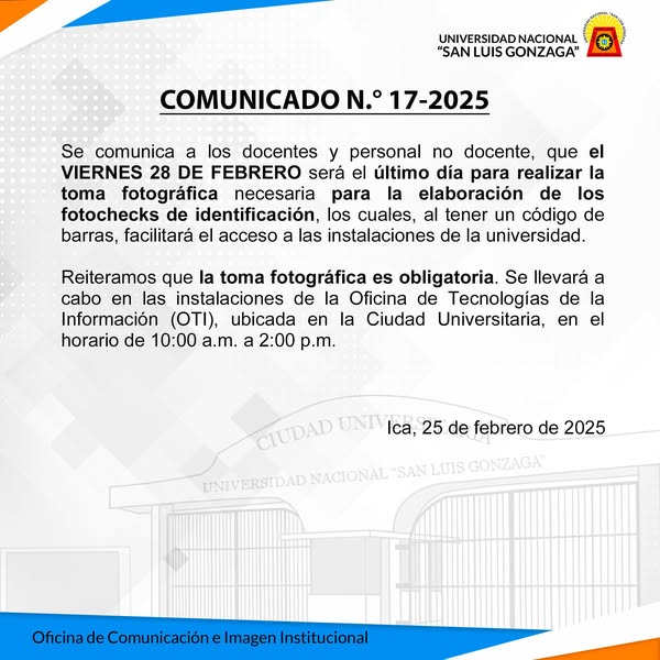 #Comunicado | El viernes 28 de febrero será el último día para realizar la toma fotográfica necesaria para la elaboración de los fotochecks de identificación para el acceso a las instalaciones de la universidad.
