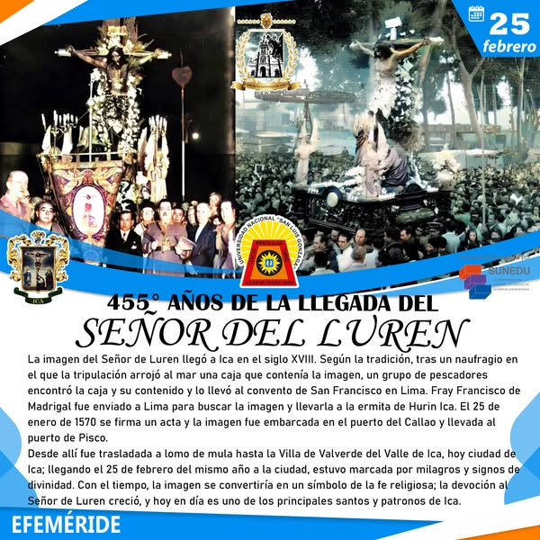 #Efemerides2025 | La imagen del Señor de Luren llegó a Ica en el siglo XVIII. Según la tradición, tras un naufragio en el que la tripulación arrojó al mar una caja que contenía la imagen, un grupo de pescadores encontró la caja y su contenido y lo llevó al convento de San Francisco en Lima. Fray Francisco de Madrigal fue enviado a Lima para buscar la imagen y llevarla a la ermita de Hurin Ica. 25 de enero de 1570 se firma un acta y la imagen fue embarcada en el puerto del Callao y llevada al puerto de Pisco.
