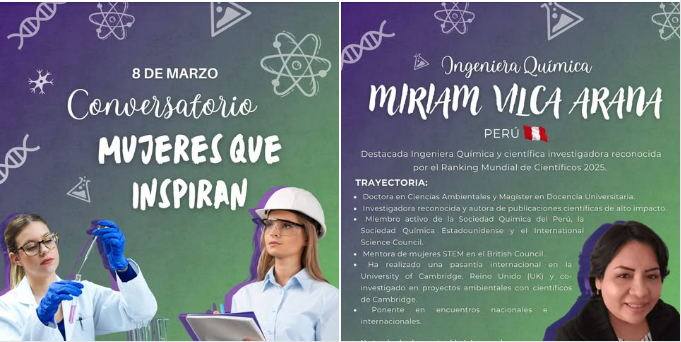 La Dra. Miriam Vilca Arana, es científica investigadora reconocida por el ranking mundial de científicos 2025, y con su amplia trayectoria académica y profesional, va a explicar como parte de su ponencia, el rol de las mujeres en la ciencia y la ingeniería.