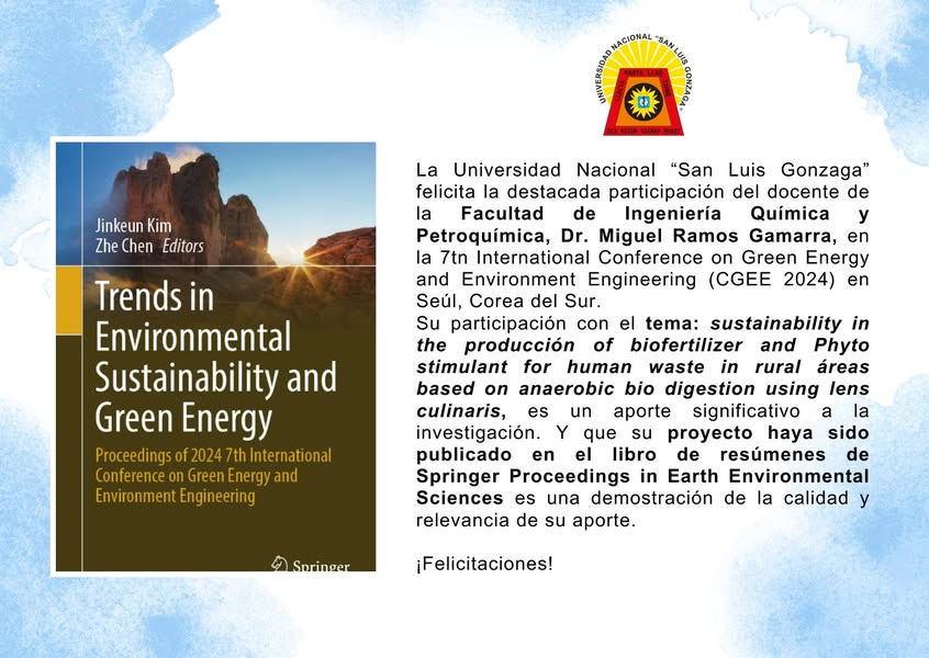 #Docentes | La Universidad Nacional “San Luis Gonzaga” felicita la destacada participación del docente de la Facultad de Ingeniería Química y Petroquímica, Dr. Miguel Ramos Gamarra, en la 7tn International Conference on Green Energy and Environment Engineering (CGEE 2024) en Seúl, Corea del Sur.