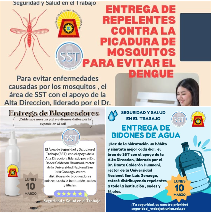 #SST | El Área de Seguridad y Salud en el Trabajo (SST), con el apoyo de la Alta Dirección, liderado por el Dr. Dante Calderón Huamani, rector de la Universidad Nacional «San Luis Gonzaga», está comprometida con el bienestar de toda la comunidad universitaria. Como parte de esta iniciativa, se distribuirán bloqueadores solares y repelentes a toda la institución, incluyendo las sedes y filiales.