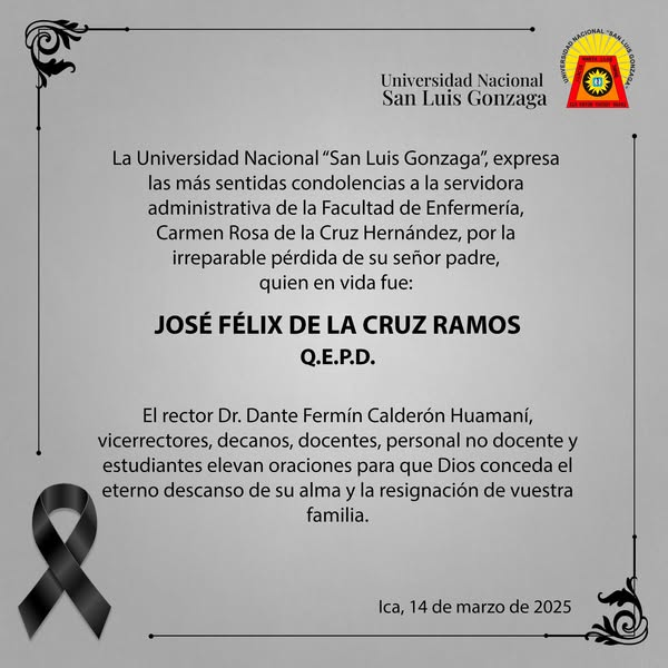 | La Universidad Nacional “San Luis Gonzaga”, expresa las más sentidas condolencias a la servidora administrativa de la Facultad de Enfermería, Carmen Rosa de la Cruz Hernández, por la irreparable pérdida de su señor padre, quien en vida fue: JOSÉ FÉLIX DE LA CRUZ RAMOS