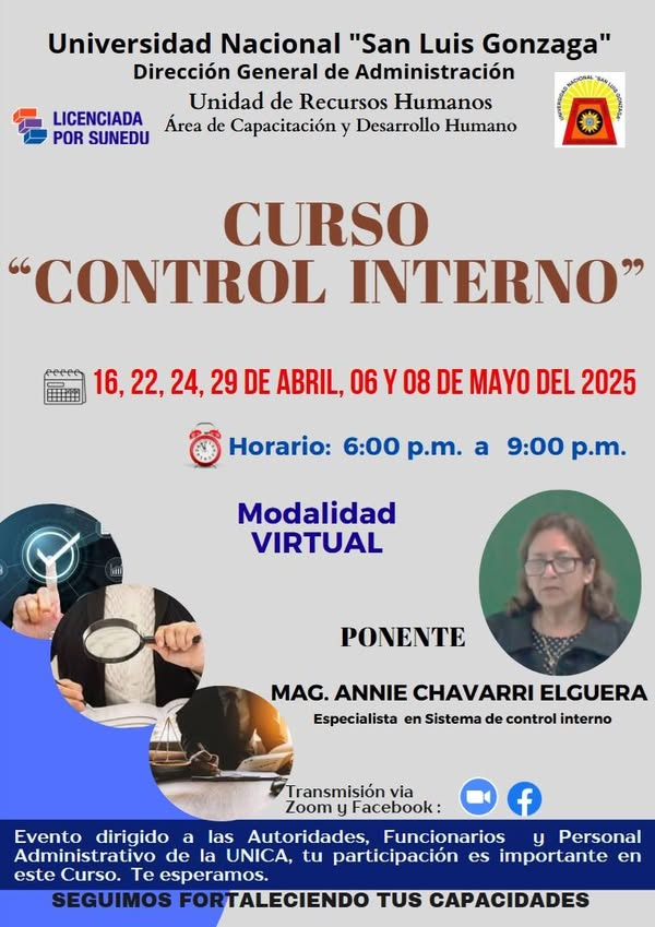 #Curso | CURSO “CONTROL INTERNO”, el cual está dirigido a Autoridades, Funcionarios y Personal Administrativo de las diversas Facultades, Direcciones y Dependencias de la Universidad Nacional “San Luis Gonzaga”. Este evento se llevará a cabo los días 16, 22, 24, 29 de abril, 06 y 08 de mayo del 2025, en el horario de: 06:00 p.m. a 09:00 p.m. (06 días), la ponencia estará a cargo de la Mag. ANNIE CHAVARRI ELGUERA, en la MODALIDAD: VIRTUAL.