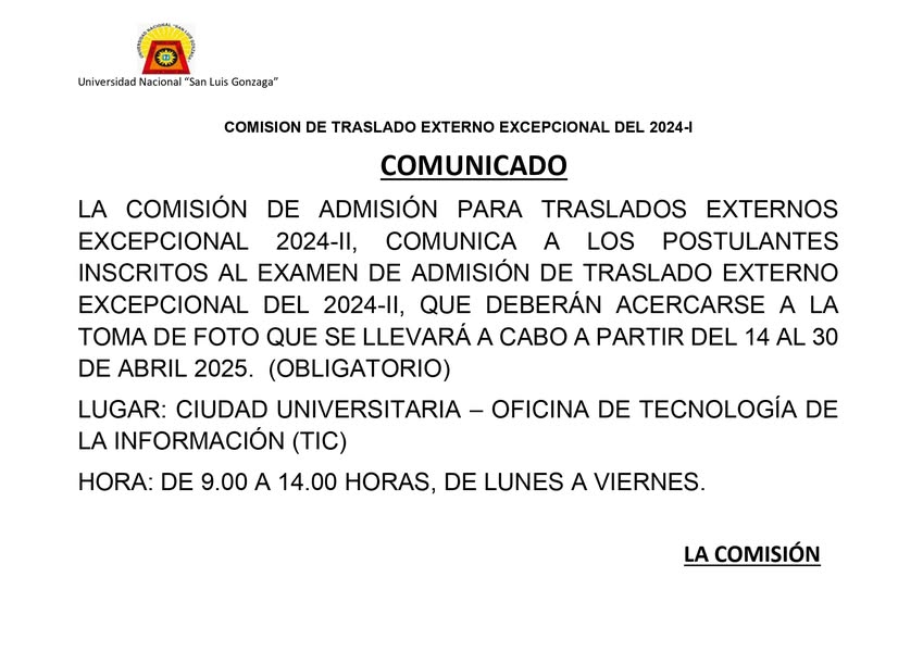 La comisión de admisión para traslados externos excepcional 2024-II, hace de CONOCIMIENTO a los postulantes inscritos al examen de admisión de traslado externo excepcional del 2024-II, que deberán acercarse a la toma de foto que se inició el 14 y que se extenderá hasta el próximo 30 de abril 2025.