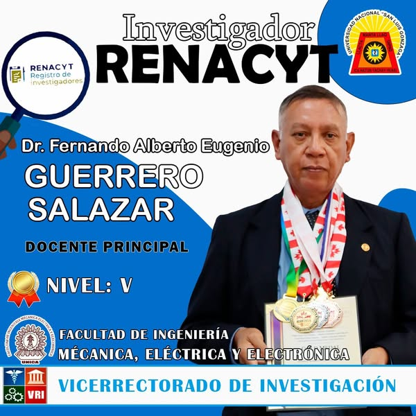 La Universidad Nacional San Luis Gonzaga expresa su orgullo por la recalificación del Dr. Fernando Alberto Eugenio Guerrero Salazar, docente principal de la Facultad de Ingeniería Mecánica Eléctrica y Electrónica, quien ha sido ascendido al nivel 5 en el Registro Nacional de Ciencia, Tecnología e Innovación Tecnológica (RENACYT).